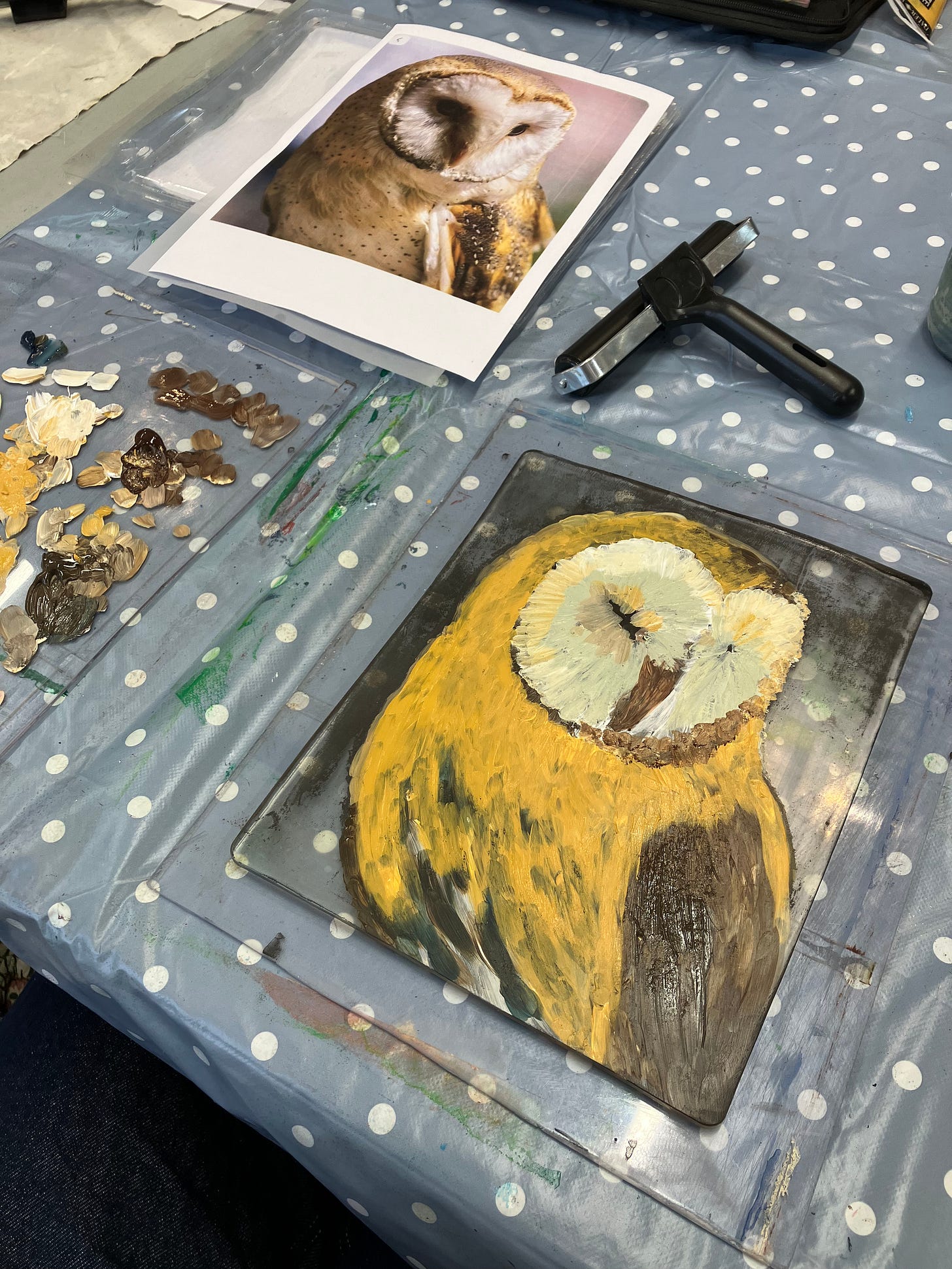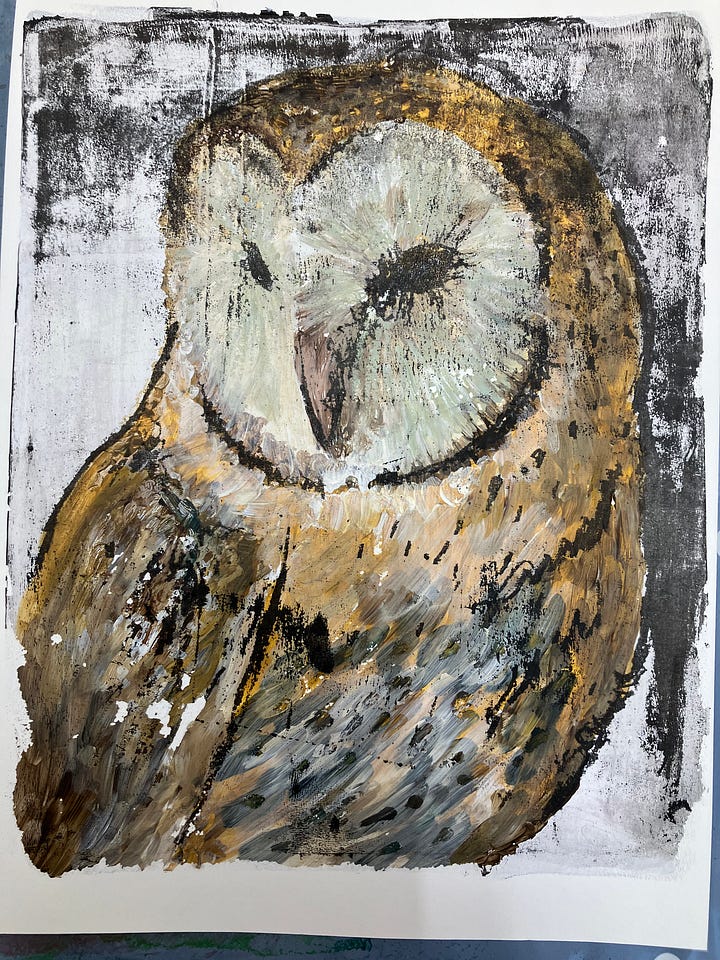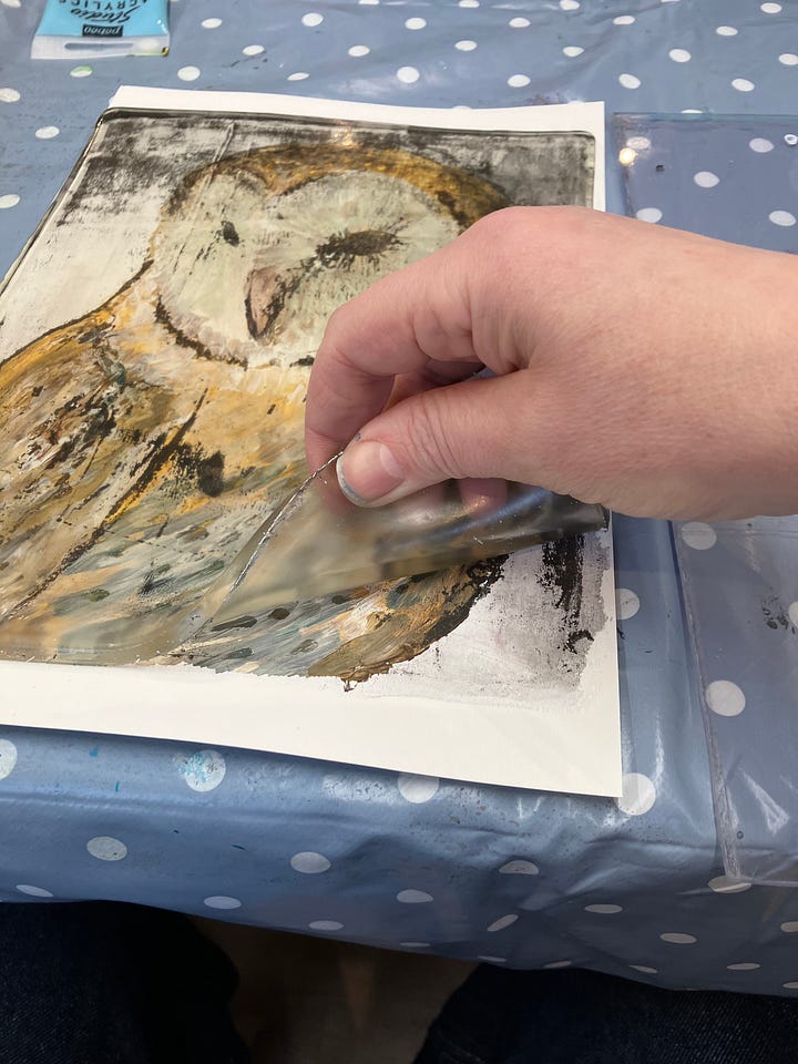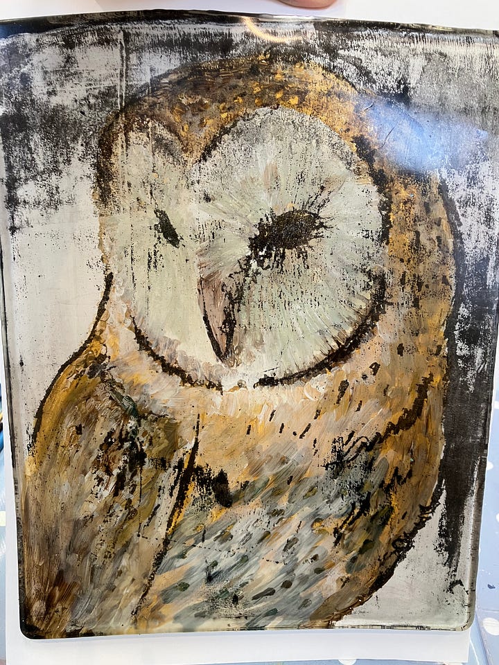 After pulling the print, we worked back into it with acrylic paint — refining areas, strengthening shadows, adding definition to the owl’s face and feathers. I loved this stage. It allowed a little reclaiming of control after the unpredictability of the plate.