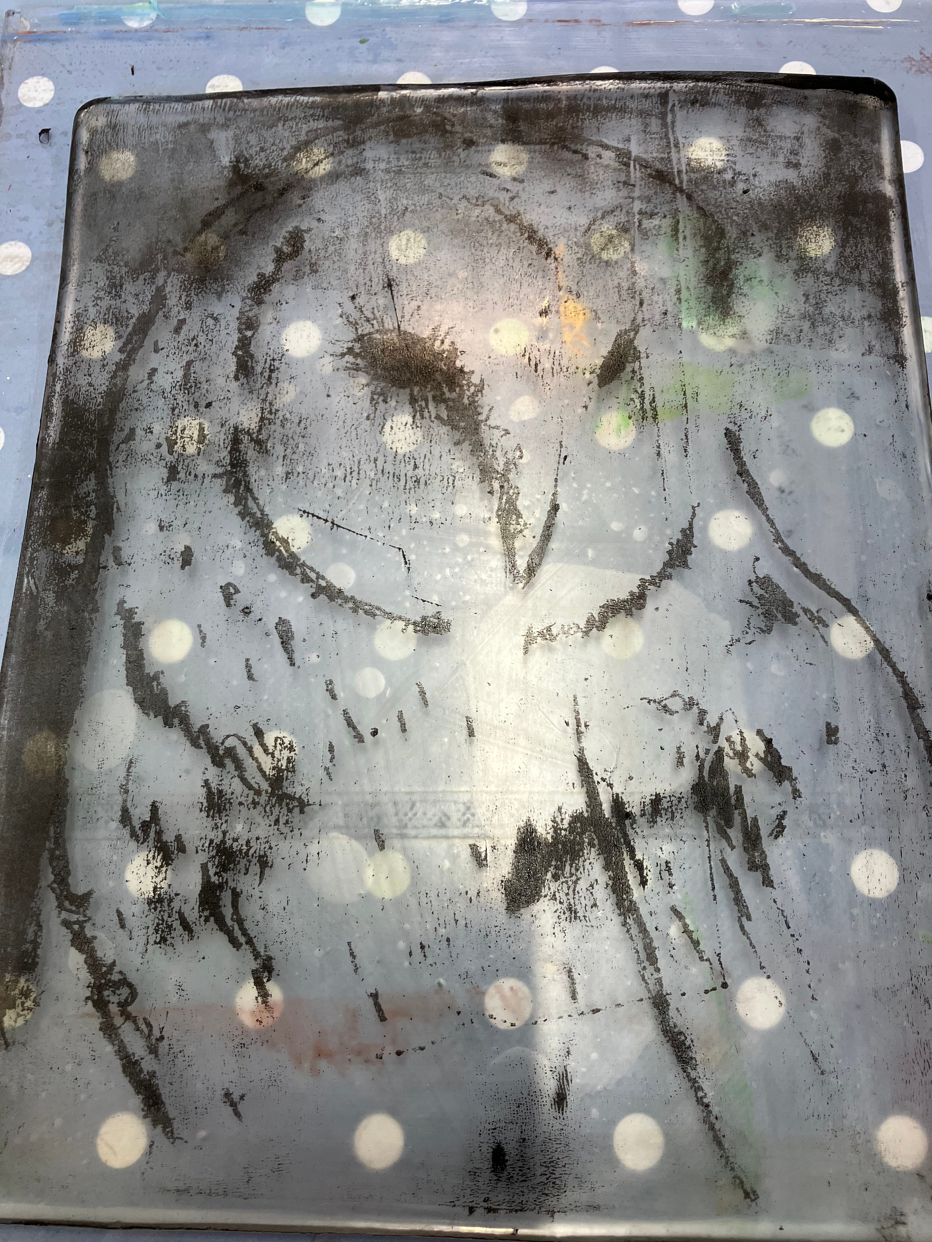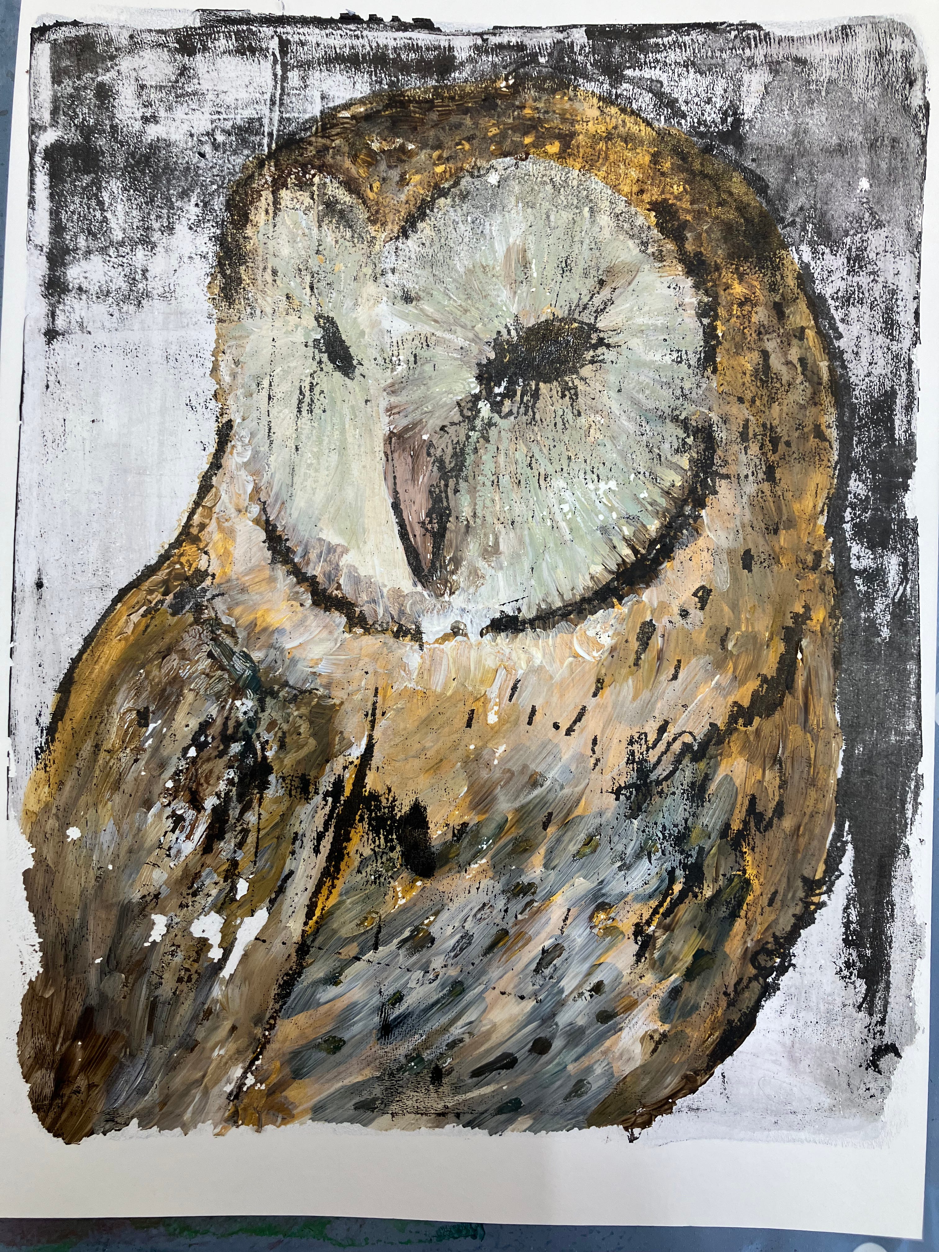 The process began with drawing using a chinagraph pencil onto paper — loose, expressive lines of the owl. That drawing was then pressed onto a layer of darker black acrylic paint on the gel plate to transfer the marks and create the first structural layer.